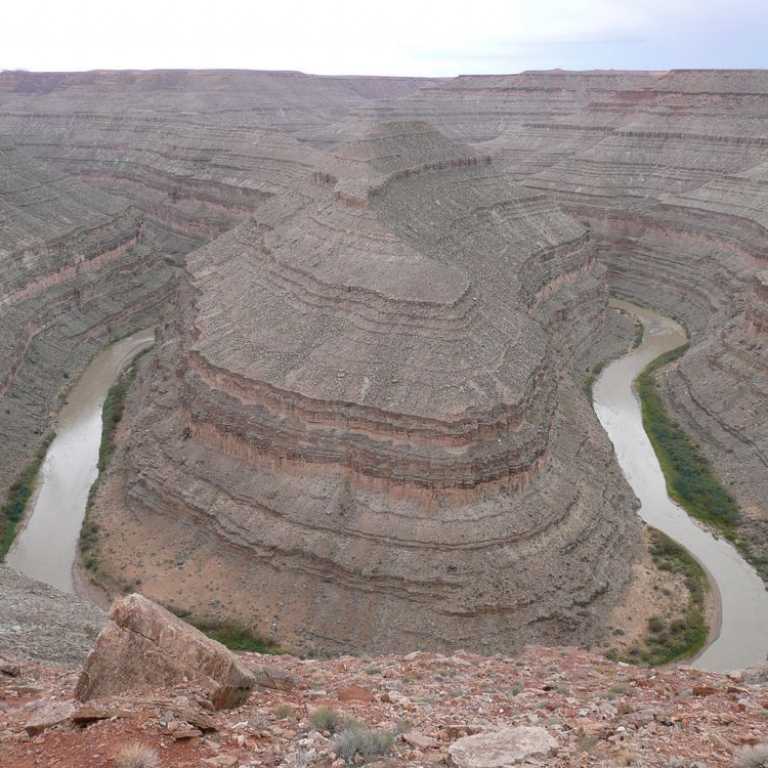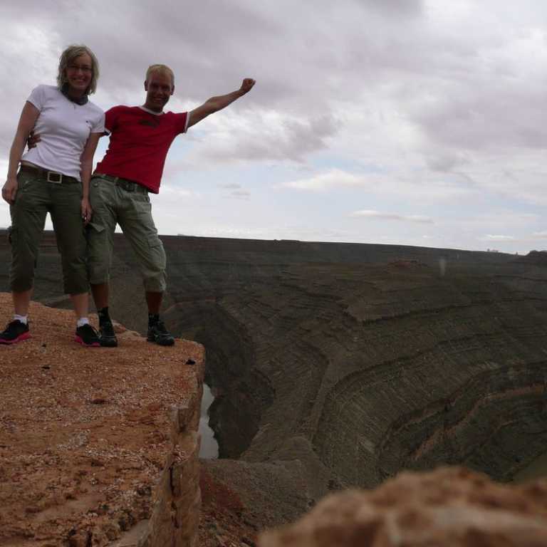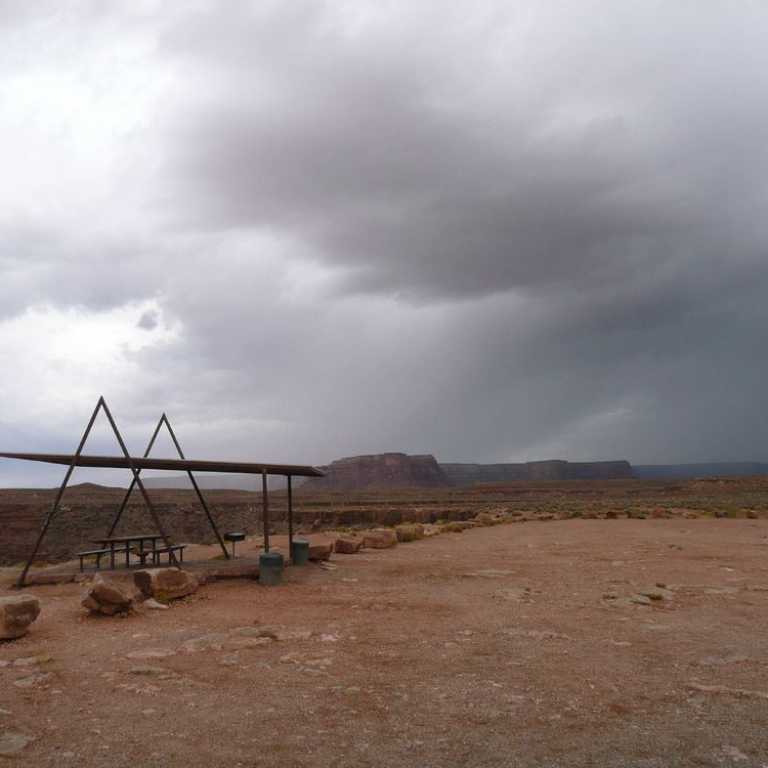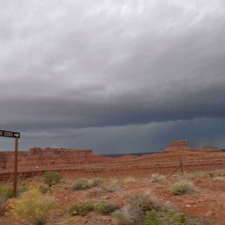 Bei bewölktem und nach Regen aussehendem Wetter packten wir unsere Koffer, tranken Tee und Kaffee und starteten unsere Tour. Wir fuhren in Richtung Süden, zuerst durch Monticello und dann weiter nach Bluff. Zwischenzeitlich regnete es ziemlich stark und die Temperaturen waren im Keller. Das waren ja schöne Aussichten dachten wir, was sich aber bald ändern würde. Kurz vor Mexican Hat bogen wir ab zum Goosenecks State Park. Am Ende einer 6 Meilen Achterbahnstraße erreichten wir einen Aussichtspunkt, von wo wir einen herrlichen Überblick auf den Canyon des Juan Rivers hatten. Hinter uns wurde es immer dunkler und ein starkes Gewitter war im Anmarsch. Somit suchten wir schnell das Weite und fuhren weiter in Richtung blauer Himmel.