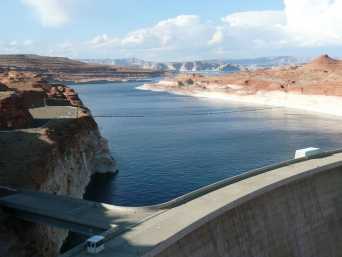 Kurz nach der Ortschaft Page gelangten wir zum riesigen Glen Canyon Dam, am Lake Powell. Wir besichtigten das Besucherzentrum, wo wir interessante Informationen über den Bau und Geschichte des Dammes bekamen. Im nahegelegenen Wal Mart kauften wir für das Abendessen ein und fuhren dann am späten Nachmittag weiter in Richtung Gran Canyon durch atemberaubende Landschaft.