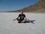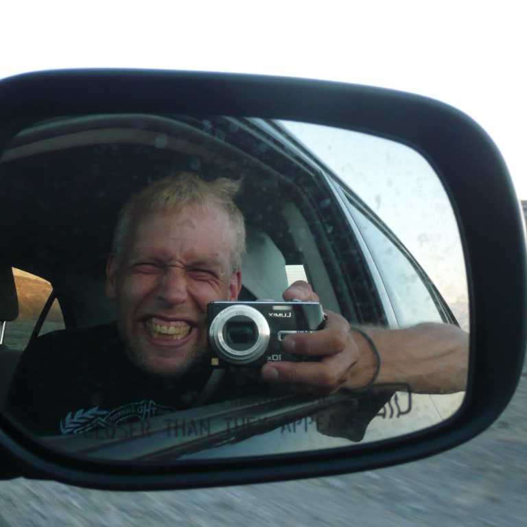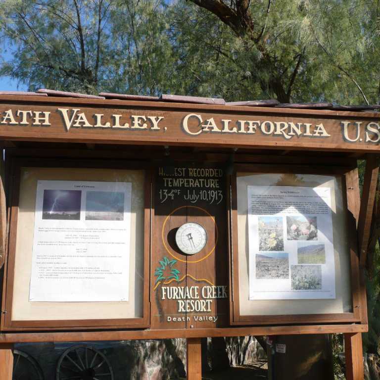 An der Straße 178 bogen wir gen Süden ab und fuhren in Richtung Badwater, dem mit 85,5 m unter dem Meeresspiegel tiefsten Punkt Nordamerikas. Mittlerweile erreichten wir eine Temperatur von 45 Grad. Tatsächlich fand gerade ein Radrennen durch das Tal des Todes statt und wir sahen immer wieder Radler bei dieser Hitze. Am tiefsten Punkt hielten wir am Parkplatz und marschierten auf der auskristallisierten Salzfläche. Wir konnten super schöne Fotos schießen in die unendliche Weite des Horizonts. Unser weiterer Weg führte uns die gleiche Straße wieder zurück bis zum Artist Drive, der abenteuerlich 5 Meilen durch eine goldfarbene Schlucht wie eine Achterbahn hindurchführt.