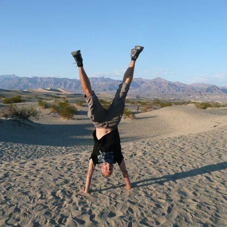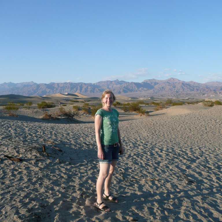 Weiter nördlich erreichten wir die Oase Furnance Creek, wo wir uns ein Eis und kalte Getränke genehmigten. An der nächsten Kreuzung bogen wir in die Straße 190 westlich ab und hielten dann am Aussichtspunkt zu den Mesquite Flat Dunes. Die weithin sichtbaren Wanderdünen erreichen eine Höhe von bis zu 30 Metern. Wir marschierten natürlich ein wenig in den Dünen, wo wir wieder herrliche Fotos machen konnten. Es lebe die Digitalfotografie. Da es schon kurz vor Sonnenuntergang war, verließen wir das Tal des Todes am Westeingang in Panamint Springs und fuhren zuerst weiter nach Westen, wo wir einen herrlichen Sonnenuntergang in den Bergen beobachten konnten. Auf dem Highway 395 ging es dann weiter nach Süden bis wir um 21 Uhr die größere Stadt Ridgecrest erreichten, wo wir am Ortseingang auch gleich ein Motel für 75 Dollar bekamen. Beim Pizzahut gab es noch eine deftige Pizza, bevor wir unter die Dusche und dann ins Bett gingen.