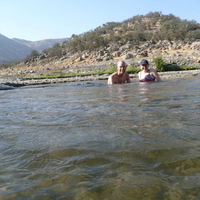 Am Kaweah River hielten wir an und suchten uns eine schöne Badestelle. Hier legten wir uns in das Wasser, was eine herrliche Abkühlung bei über 35 Grad Lufttemperatur war. Wir fuhren noch kurz in den Park, entschieden uns aber wieder umzukehren, da die Zeit schon zu weit fortgeschritten war. Wir fuhren deshalb wieder zurück zur Hauptstraße und setzten unserer Reise in Richtung Yosemite Nationalpark fort. Um ca. 19 Uhr erreichten wir die Stadt Fresno, wo wir im Gutscheinheft das Motel Rodeway Inn für 60 Dollar fanden. Es war zwar kein 5 Sterne Hotel, aber für eine Übernachtung ganz ok. Im Dennys gab es noch Salat, Chickenburger und Fisch, bevor wir uns zum Schlafen legten.
