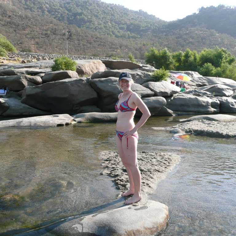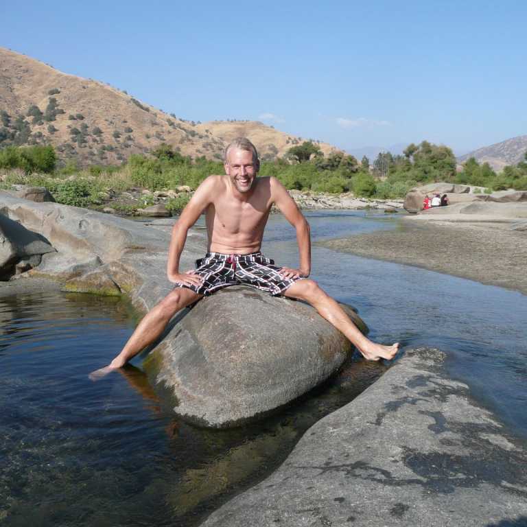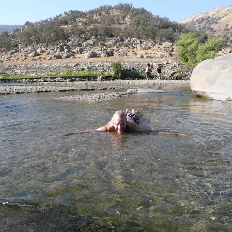 Am Kaweah River hielten wir an und suchten uns eine schöne Badestelle. Hier legten wir uns in das Wasser, was eine herrliche Abkühlung bei über 35 Grad Lufttemperatur war. Wir fuhren noch kurz in den Park, entschieden uns aber wieder umzukehren, da die Zeit schon zu weit fortgeschritten war. Wir fuhren deshalb wieder zurück zur Hauptstraße und setzten unserer Reise in Richtung Yosemite Nationalpark fort. Um ca. 19 Uhr erreichten wir die Stadt Fresno, wo wir im Gutscheinheft das Motel Rodeway Inn für 60 Dollar fanden. Es war zwar kein 5 Sterne Hotel, aber für eine Übernachtung ganz ok. Im Dennys gab es noch Salat, Chickenburger und Fisch, bevor wir uns zum Schlafen legten.