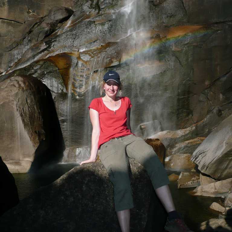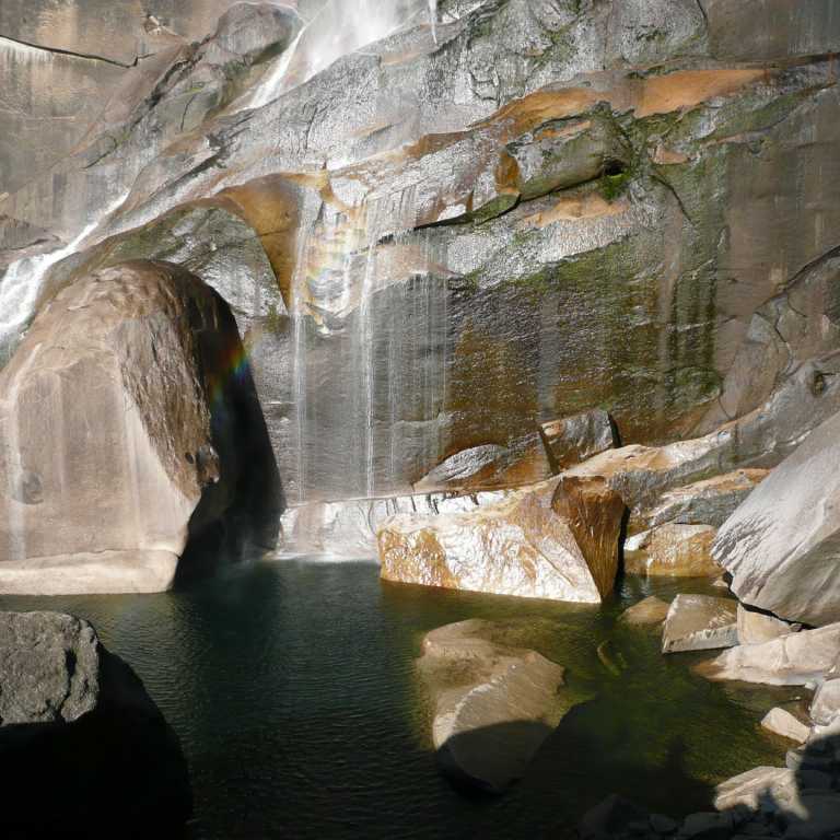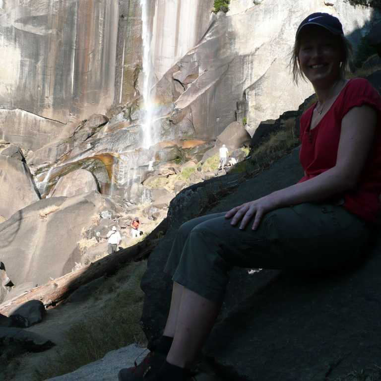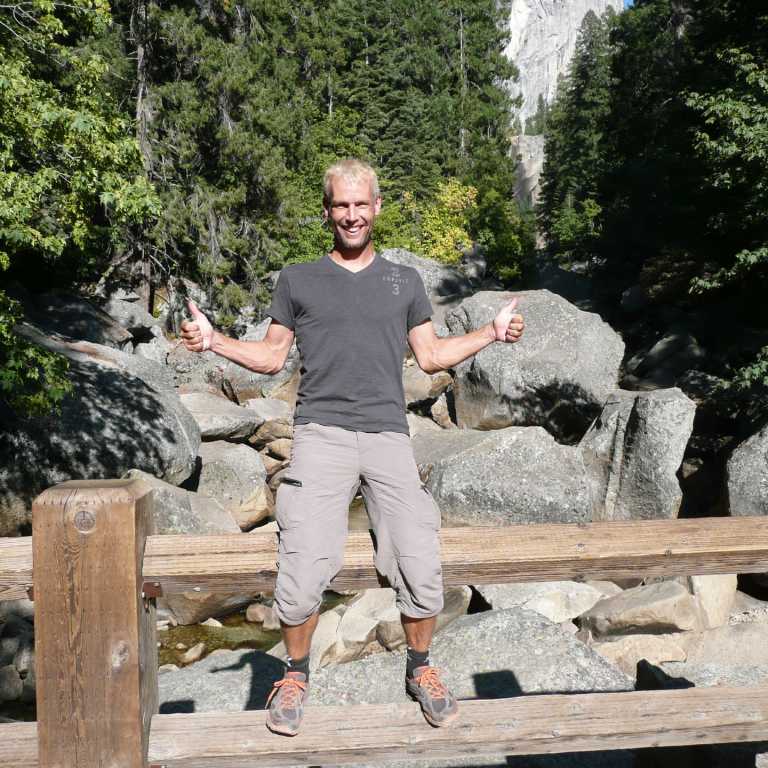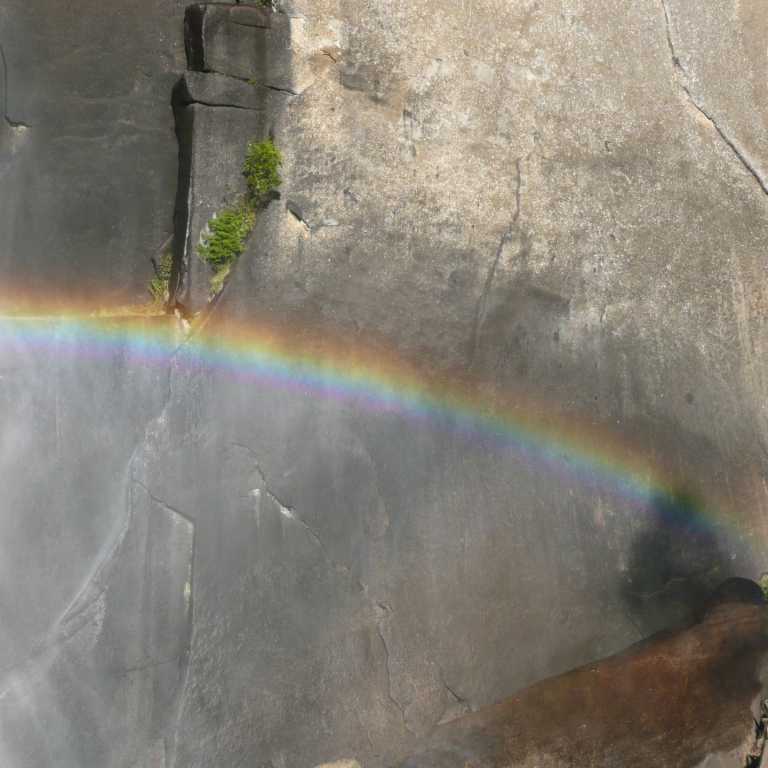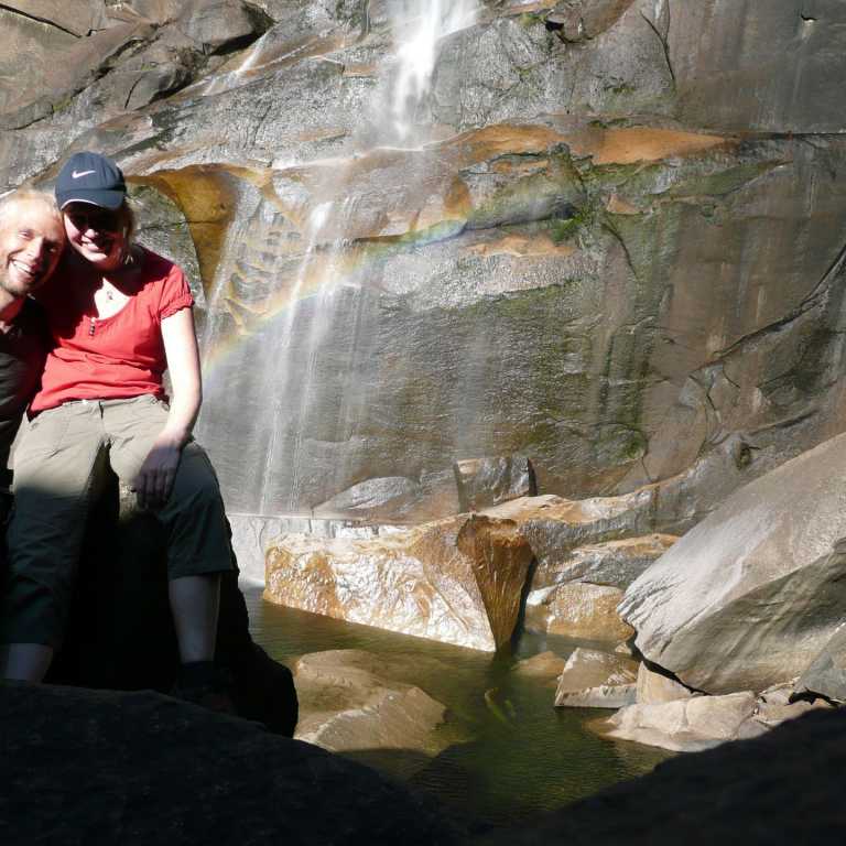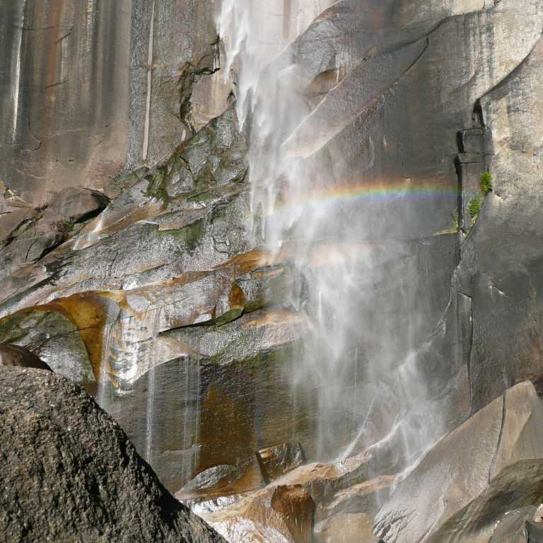 Als nächstes fuhren wir in das wunderschöne, grüne Yosemite Valley. Am Ende des Tals parkten wir unser Auto und starteten den nächsten Trail. Unser Ziel waren die Vernal Falls, wieder ca. 2,5 km und 300 Hm entfernt. Die Wasserfälle lagen idyllisch vor uns und wir konnten herrliche Fotos mit einem Regenbogen, der davor entstand, machen.