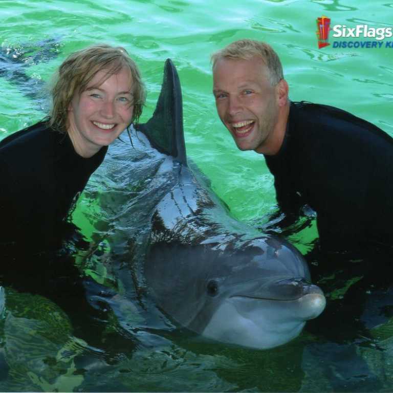 Pünktlich um 14.30 Uhr wurden wir von einer netten Delfintrainerin am Six Flags Parkplatz abgeholt und im Schulungsraum erklärte sie uns die Lebensweise, Beschaffenheit und vieles mehr von Delfinen. Nach ca. 45 sehr interessanten Minuten durften wir einen Neoprenanzug anziehen und gingen mit einer anderen Trainerin zum Becken mit 3 Delfinen. Sie erklärte uns genau den Umgang mit Delfinen. Wir durften die Tiere berühren und füttern was sehr Interessant war. Das Highlight war eine Runde mit dem Delfin durch das Becken mit den Händen an der Rückenflosse. Auch einen Kuss durften wir dem Tier geben. Es war schon sehr auf Touristen ausgerichtet, da natürlich auch Fotos geschossen wurden und wir diese kaufen konnten. Trotzdem hatten wir einen einigermaßen positiven Eindruck, da die Delfine trotz Gefangenschaft sehr alt und auch hier geboren werden und teilweise mit Verletzungen zum Park gebracht und hier gerettet wurden. Auch die Becken machten einen ausreichenden Eindruck.