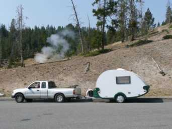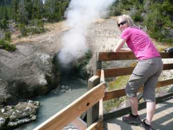Am Yellowstone Lake (131 m tief) legten wir uns in die Sonne und gingen mit den Füßen in das eisige Wasser. Nach einer Stunde Pause fuhren wir über den Craig Pass (2518m) zum berühmtesten Geysir, dem "Old Faithful".