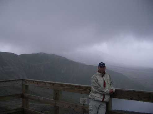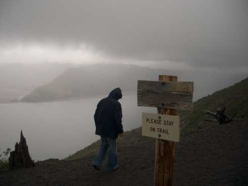 Am Ziel angelangt, konnten wir einen Blick auf den in Wolken liegenden Mount St. Helens erhaschen. Wir gingen zum höchsten Punkt am Windy Ridge, aber die Aussicht ließ uns sehr im Stich. Der Spirit Lake lag neben uns, aber der Vulkan war nur in Wolken. Es war windig, es regnete und die Wolken hingen tief. Nach ein paar Minuten Fußmarsch entschlossen wir uns wieder den Rückweg anzutreten.