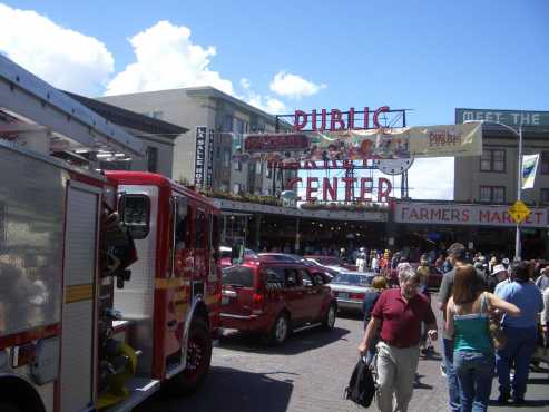 Das Wetter wurde immer besser. Wir hatten wieder blauen Himmel und viel Sonne. In der Nähe des Space Needles fanden wir eine Monorailstation. Mit der Monorail fuhren wir dann in die Altstadt und dem Hafen. Hier schlenderten wir durch die Gassen und besuchten einen großen Marktplatz, den Pike Place Market, der als Seele von Seattle gilt. Der älteste ständige Bauernmarkt wurde 1907 gegründet. Hier wurde frischer Fisch und viele andere Waren angeboten. Nachdem wir im Schnelldurchgang den Markt und die Altstadt gesehen hatten, fuhren wir wieder mit der Monorail zurück zum Space Needle.