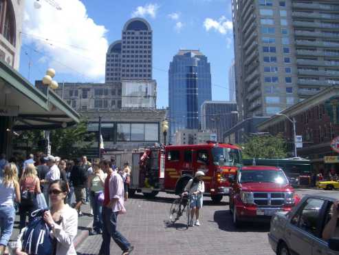 Das Wetter wurde immer besser. Wir hatten wieder blauen Himmel und viel Sonne. In der Nähe des Space Needles fanden wir eine Monorailstation. Mit der Monorail fuhren wir dann in die Altstadt und dem Hafen. Hier schlenderten wir durch die Gassen und besuchten einen großen Marktplatz, den Pike Place Market, der als Seele von Seattle gilt. Der älteste ständige Bauernmarkt wurde 1907 gegründet. Hier wurde frischer Fisch und viele andere Waren angeboten. Nachdem wir im Schnelldurchgang den Markt und die Altstadt gesehen hatten, fuhren wir wieder mit der Monorail zurück zum Space Needle.