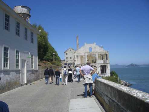 Nach einer 20 minütigen Überfahrt, von wo aus wir eine herrliche Sicht auf San Francisco und die Golden Gate Bridge hatten, erreichten wir die Gefängnisinsel. Wir gingen von Bord und wurden gleich am Pier durch die Menschenmassen geschoben. Die Besucher verliefen sich allmählich auf dem Weg zum Zellengebäude. Wir passierten das Wachhaus und den Sturmgang. Alles ist schon leicht verfallen und man erkennt den Zahn der Zeit. Weiter gelangten wir zur Reparaturwerkstatt und dem Offiziersklub (der schon ohne Dach ist). Der Weg führte uns an der Militärkapelle und Wasserturms vorbei, bis wir zum Eingang in das Zellengebäude gelangten.