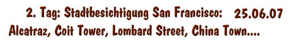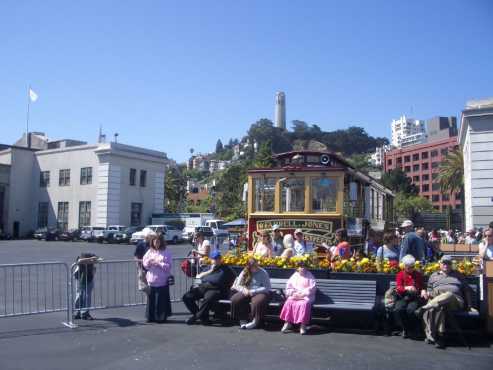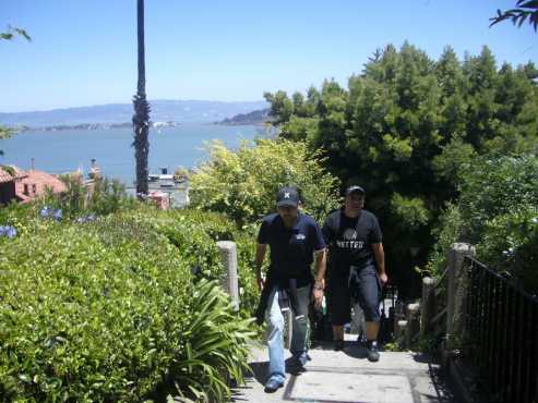 So steil ist sie und zudem mit Ziegelsteinen gepflastert. In atemberaubenden Kurven überwindet sie das Gefälle des Russian Hill. Über die Treppen an der Seite erklommen wir die Lombard Street die über und über mit Blumen beflanzt war. Am nächsten Tag ging es auch noch 3 mal mit dem Auto hinunter weil es dem Lenker so viel Spaß machte, die engen Kurven hinunter zu "sausen". Am oberen Ende der Lombard Street fährt die Cable Car.