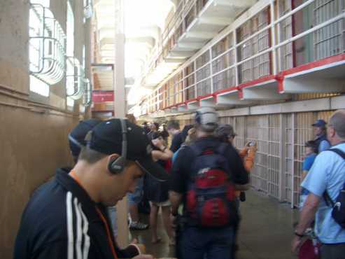 Nach einer 20 minütigen Überfahrt, von wo aus wir eine herrliche Sicht auf San Francisco und die Golden Gate Bridge hatten, erreichten wir die Gefängnisinsel. Wir gingen von Bord und wurden gleich am Pier durch die Menschenmassen geschoben. Die Besucher verliefen sich allmählich auf dem Weg zum Zellengebäude. Wir passierten das Wachhaus und den Sturmgang. Alles ist schon leicht verfallen und man erkennt den Zahn der Zeit. Weiter gelangten wir zur Reparaturwerkstatt und dem Offiziersklub (der schon ohne Dach ist). Der Weg führte uns an der Militärkapelle und Wasserturms vorbei, bis wir zum Eingang in das Zellengebäude gelangten.